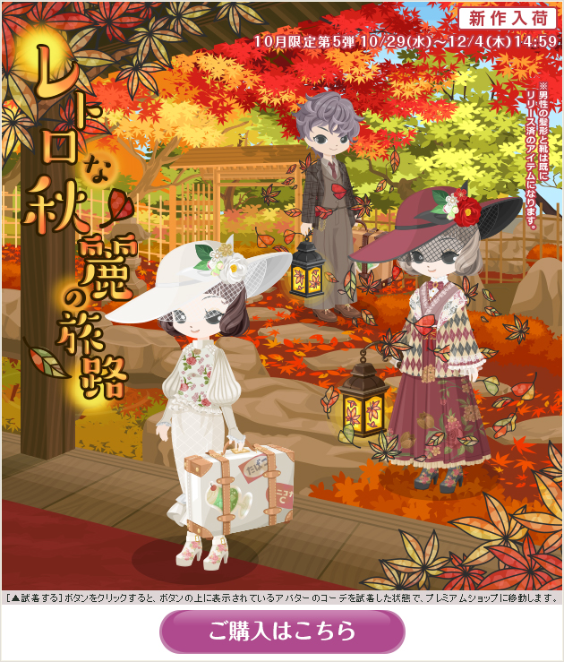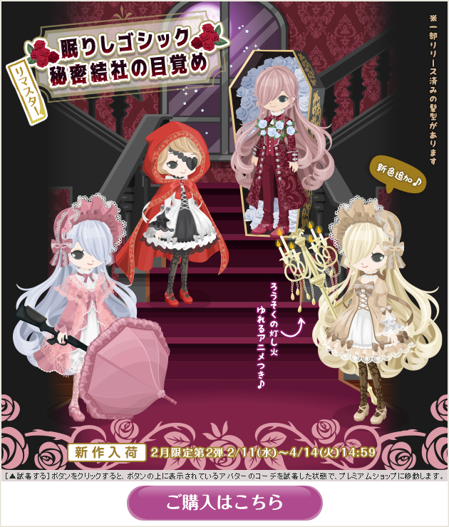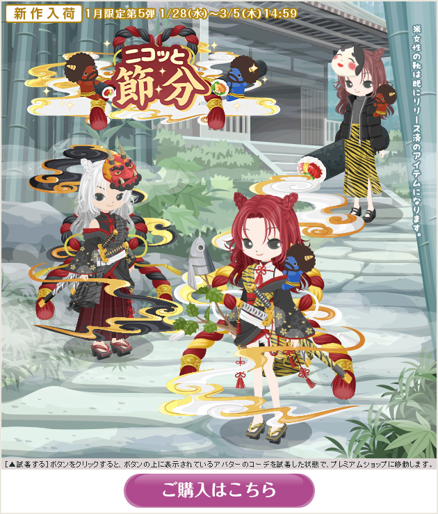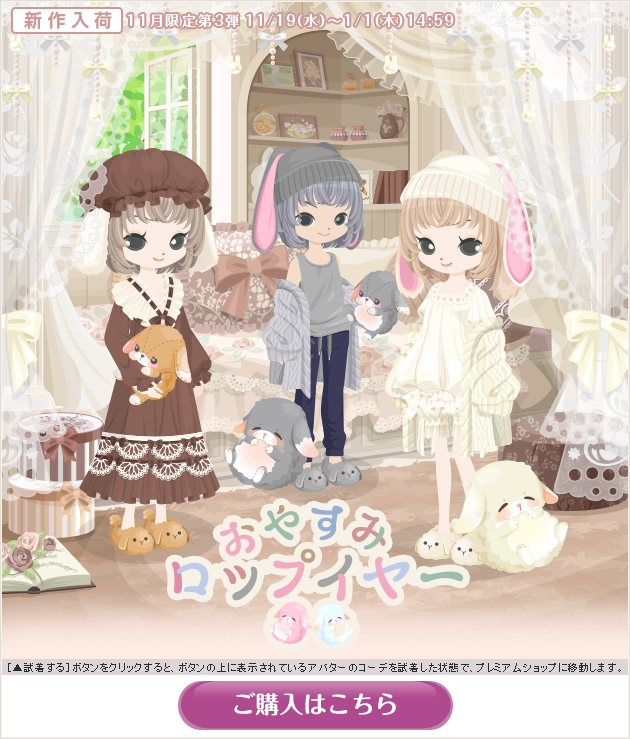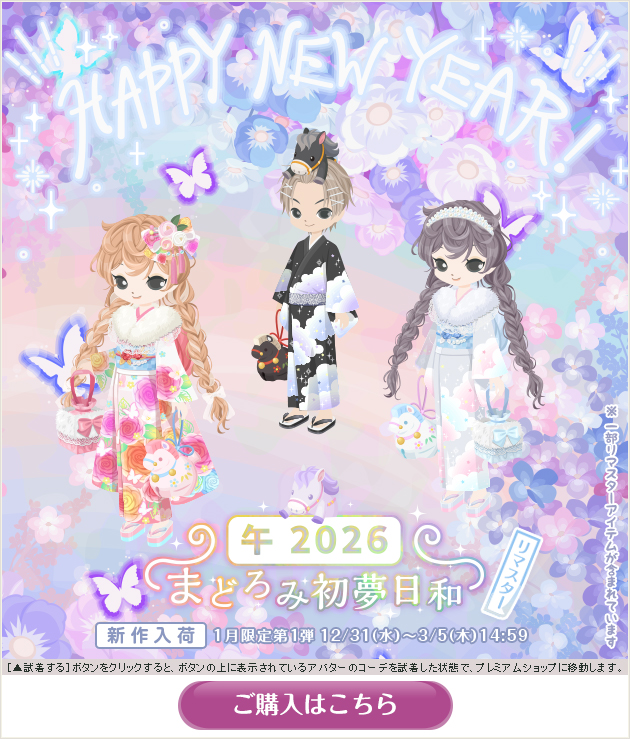 ※画像内のコーディネートには、無料ショップで取り扱っているアイテムや、販売期間外のアイテムが含まれていることがありますので、「このコーデを試着」ボタンをクリックしても、完全に画像と同じコーディネートにはならないことがあります。