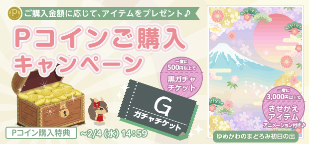 【開始】Pコイン購入特典/黒ガチャチケット&背景